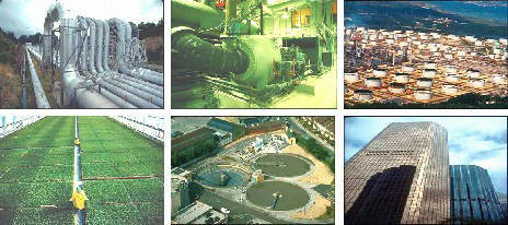 unconnected buildings, large water treatment facilities, potable water facilities, elevator banks, large buildings, farms, cattle ranches, pipelines, clean rooms, underground cables, chemical treatment tanks in a large building complex, reservoirs, rivers, malls, etc.
